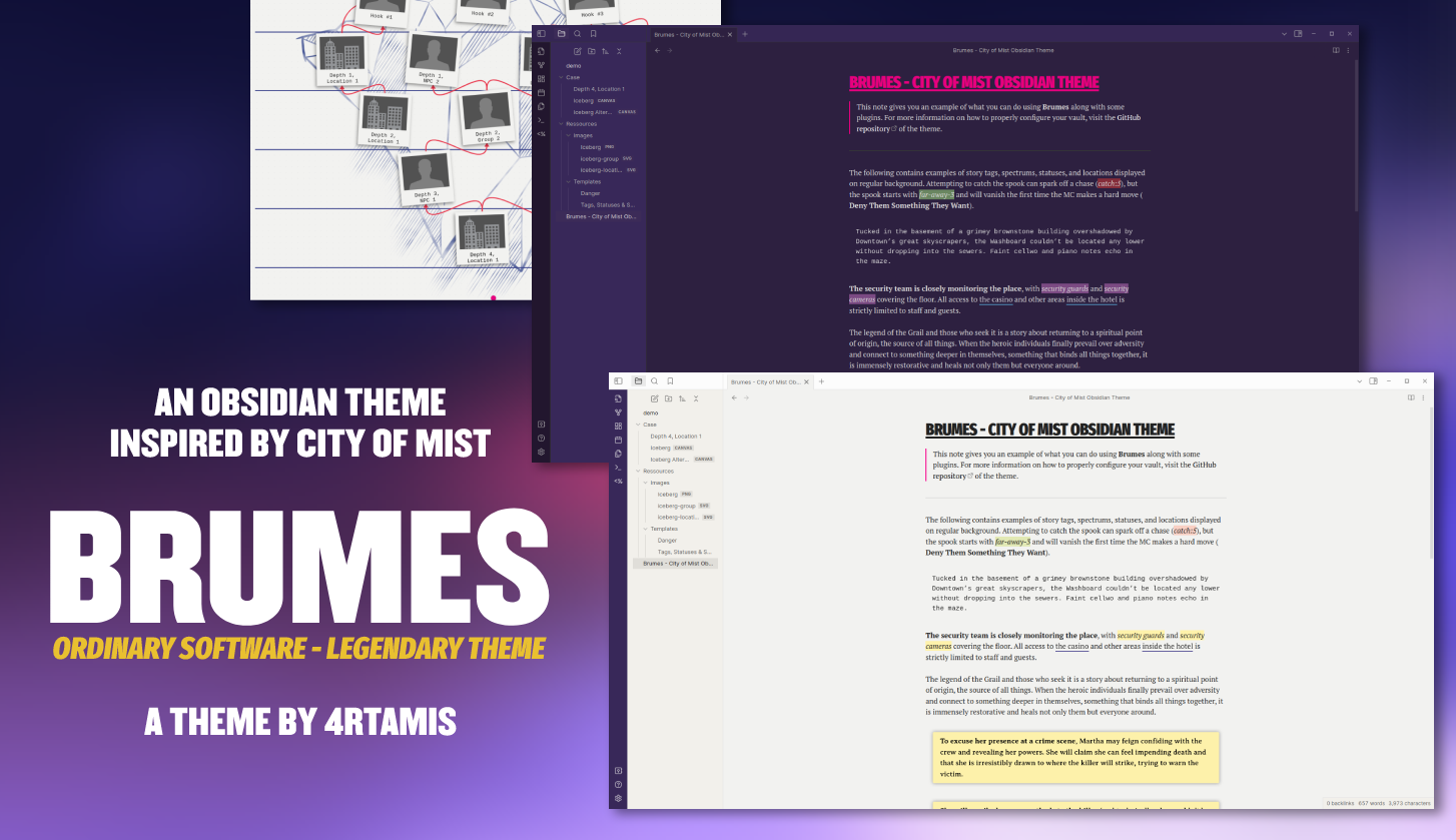 Brumes is an [Obsidian](https://obsidian.md) theme based on the award-winning tabletop role-playing game [City of Mist](https://cityofmist.co/). It aims to imitate the overall style of the City of Mist rulebooks and to provide easy-to-use features for the MC to easily prepare her cases.