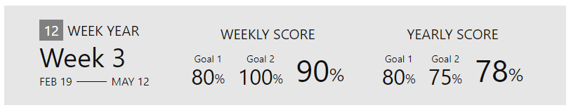 This is a sample vault that shows how I keep track of the 12 week year. In your weekly note this nice little widget is rendered showing you your progress on the 12 week year for this week and until this week.