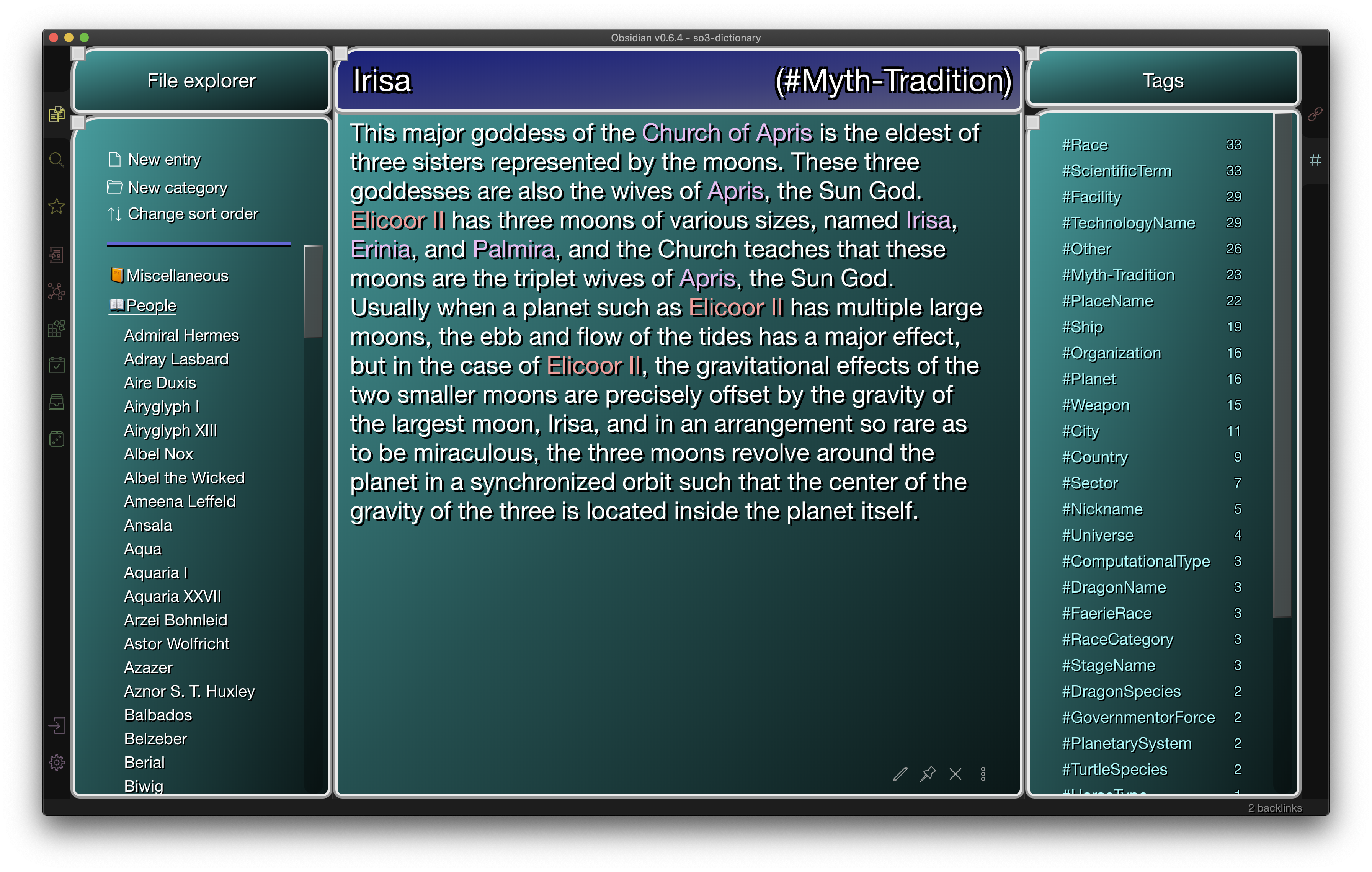 - Certain entry types (such as "Myth/Tradition") were altered to get around Obsidian's tag-parsing limitations.