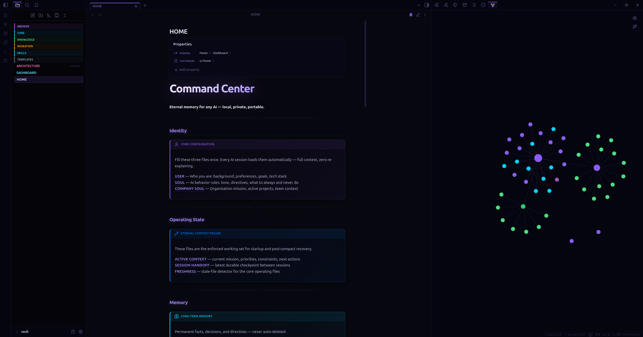 Your AI shouldn't start from scratch every session. Command Center gives any AI tool permanent, searchable memory stored as Markdown files you can read, edit, and browse in Obsidian.