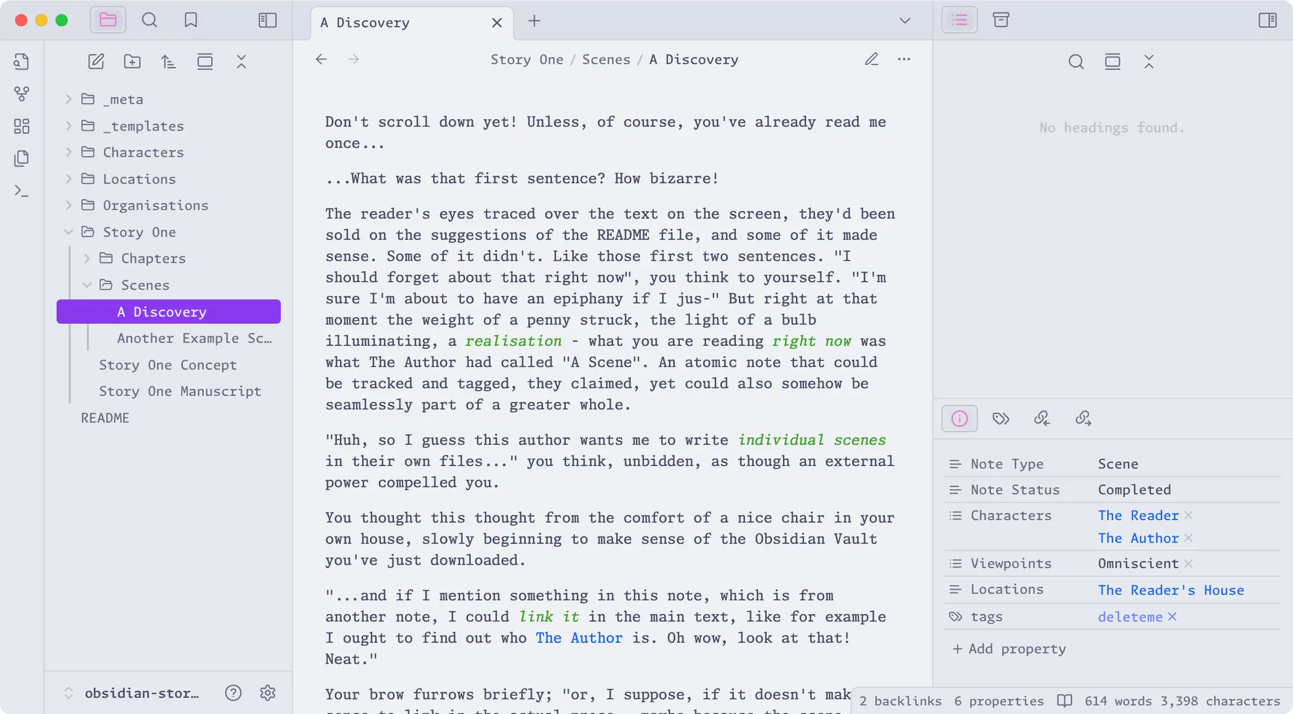Once you download it and open it in Obsidian I'd suggest you start familiarising yourself by going and reading the first scene in this bare-bones example story... [[Story One/Scenes/A Discovery|A Discovery]]. You can just click that link.