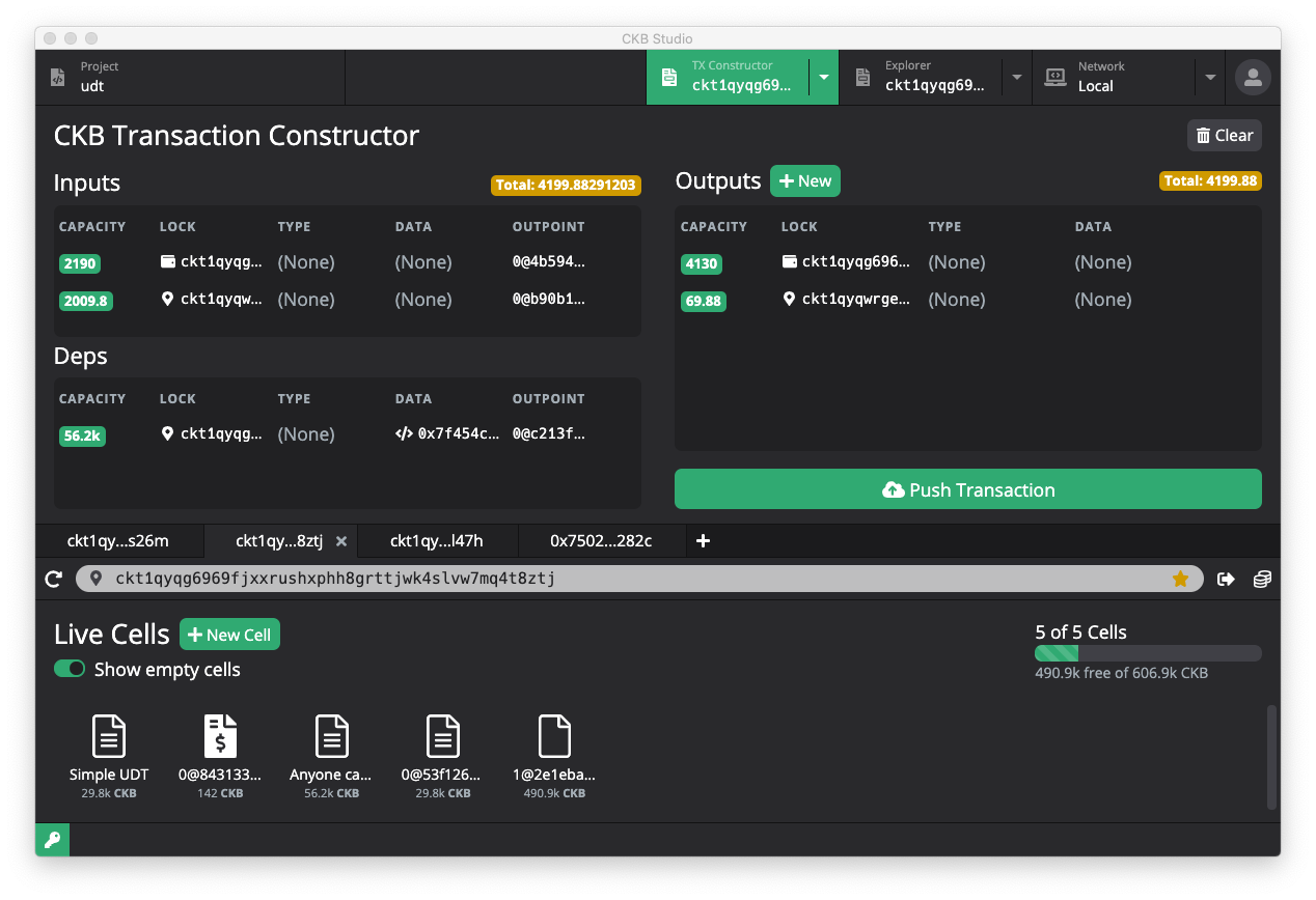 Cells are the fundamental elements to form CKB transactions. The bottom half of the interface is a cell explorer where you can look through available cells (live cells) for each address. To learn more about CKB cells, please refer to the cell model.