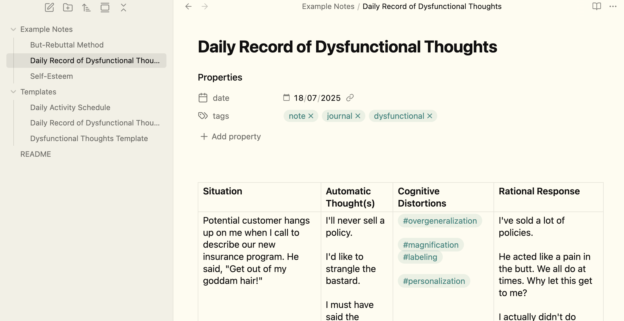 An Obsidian vault template designed for therapy, inspired by the methods from the book "Feeling Good" by David Burns.