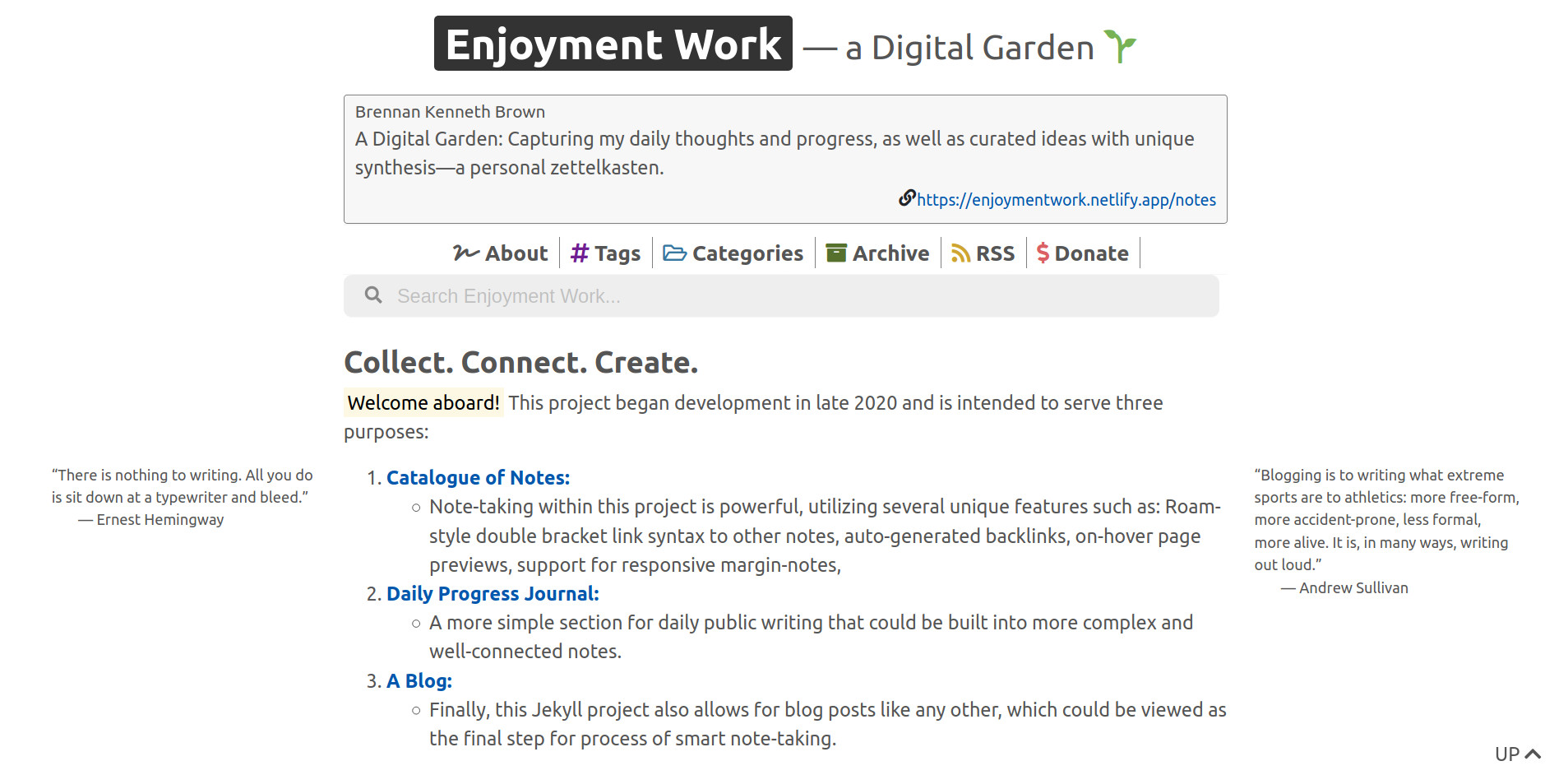 The next step for Enjoyment Work is to properly configure the syntax required to work with [**Obsidian**](https://obsidian.md/), a powerful knowledge base that works on top of a local folder of plain text Markdown files. Which would ultimately allow somebody to turn their Obsidian notes into an online blog by simply using the `_notes` directory.