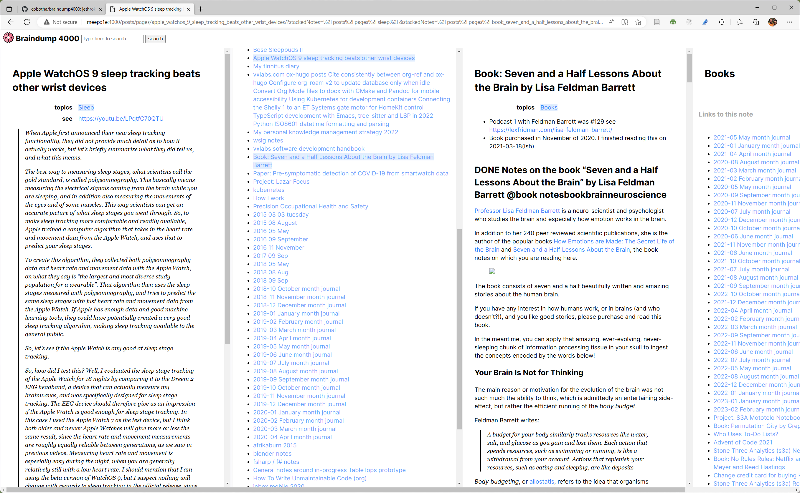 In the screenshot below, I started with the Apple WatchOS 9 sleep tracking video note, from there the Sleep backlinks page, then the Seven and a Half Lessons about the Brain book notes and finally my Books backlinks.