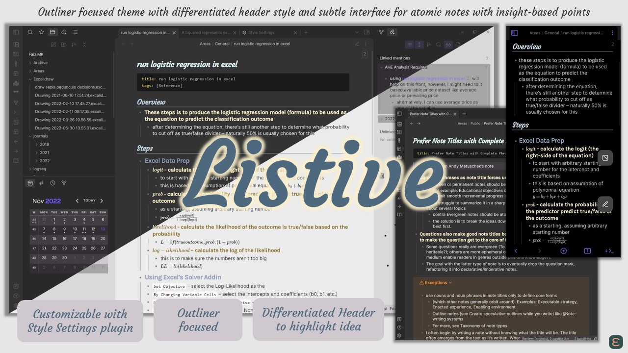 Outliner focused theme with differentiated header style and subtle interface for atomic notes with insight-based points