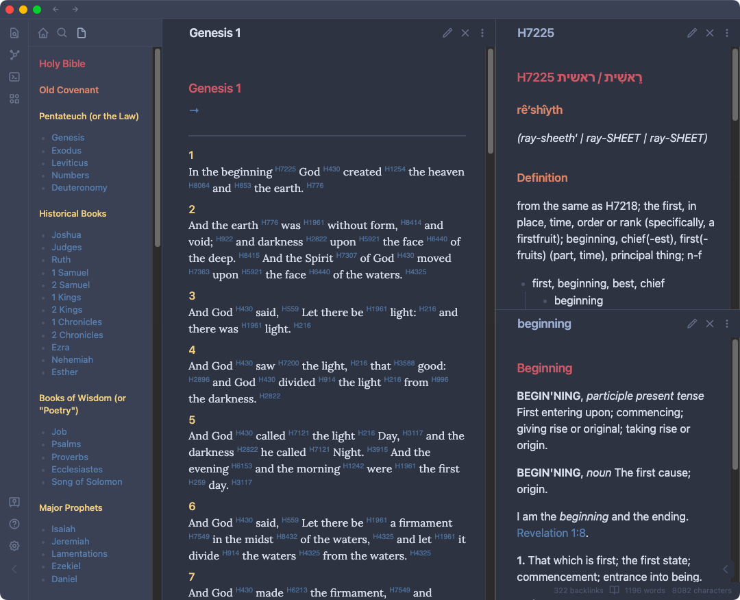 Markdown based Holy Bible, Strong's Hebrew/Greek Lexicons, and 1828 Noah Webster's American DIctionary, created for the Obsidian.md knowledge-management application.