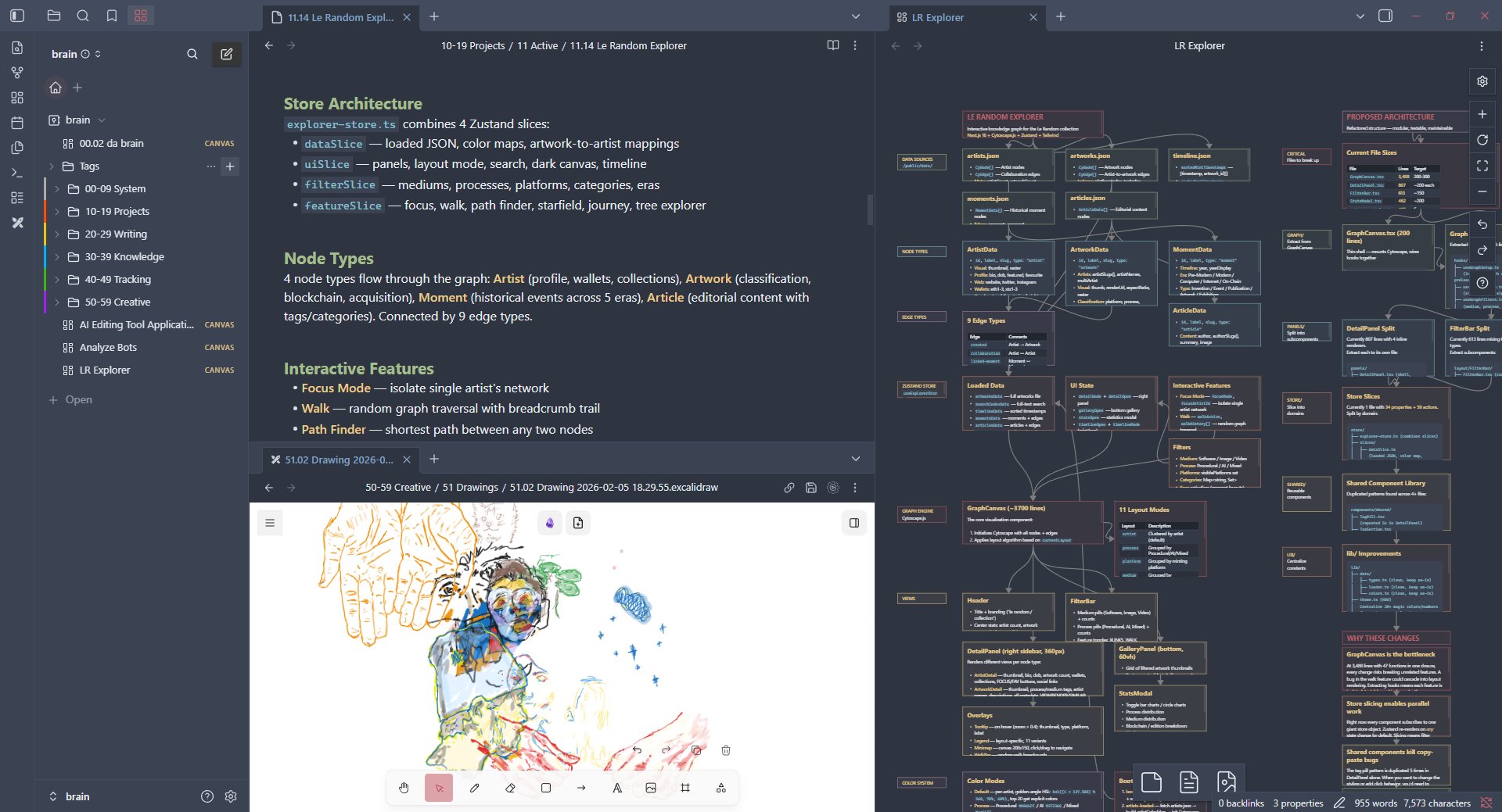 Project files get auto-numbered (`11.01`, `11.02`, etc.) and follow a consistent format with stack tables, architecture notes, and dated dev logs. Architecture canvases are color-coded Obsidian canvas files with nodes grouped by layer.