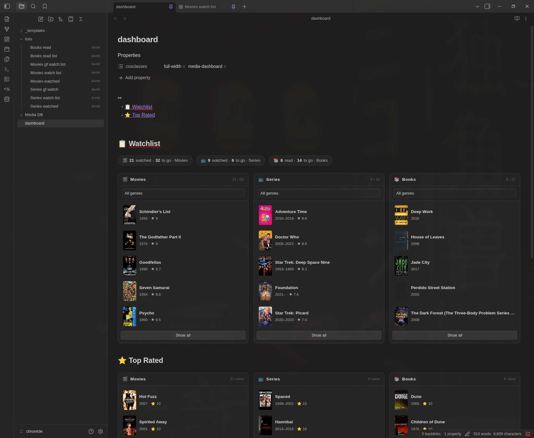 - šØ Custom dashboard ā built with DataviewJS and CSS snippets, showing your watchlist and top rated media at a glance