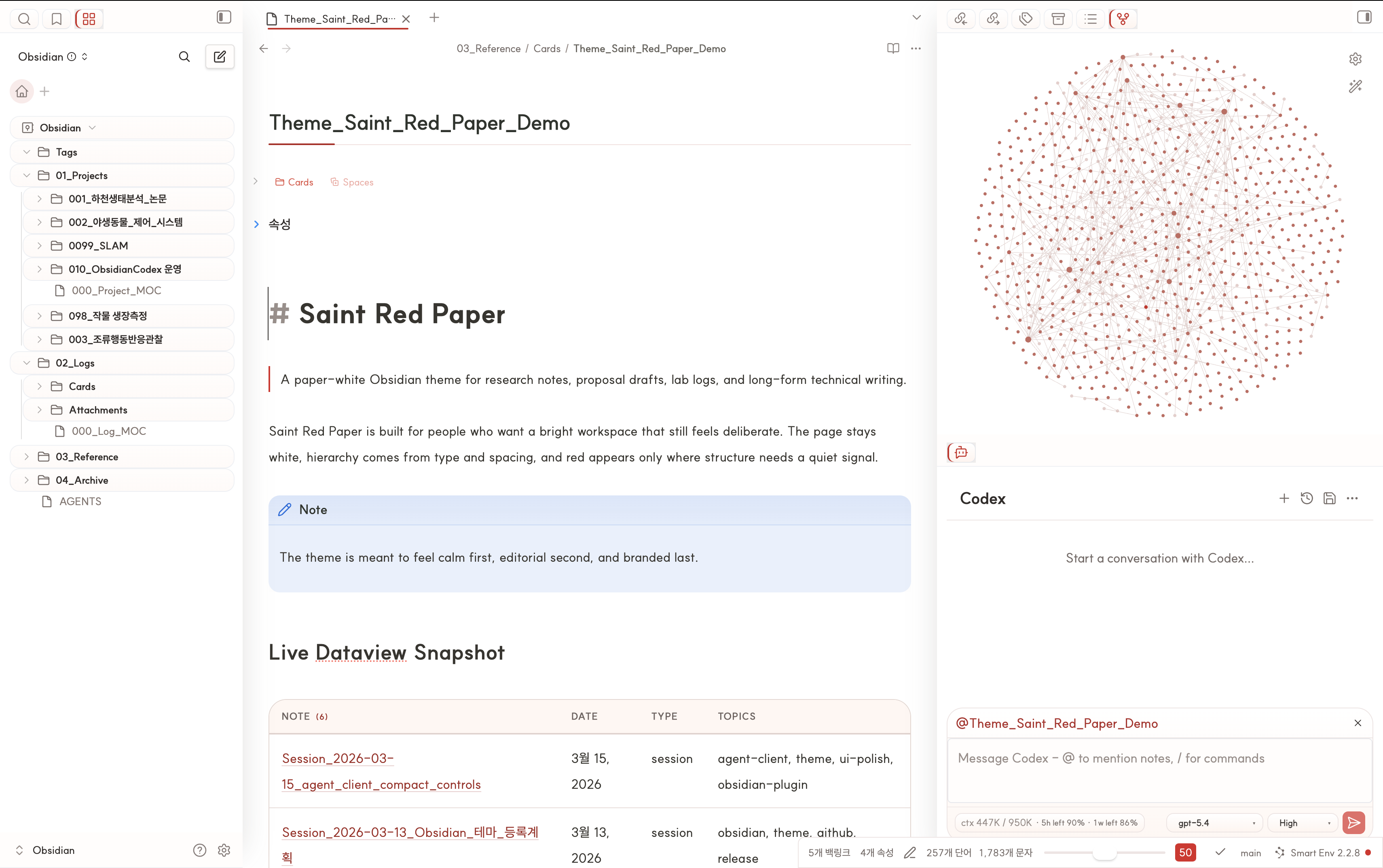 modesis declared as["dark", "light"], but Saint Red Paper is still intentionally positioned as a light-first theme.publishis omitted for now because Obsidian Publish support has not been explicitly validated yet.- The screenshot field above now points to the main light workspace capture kept in this repository.