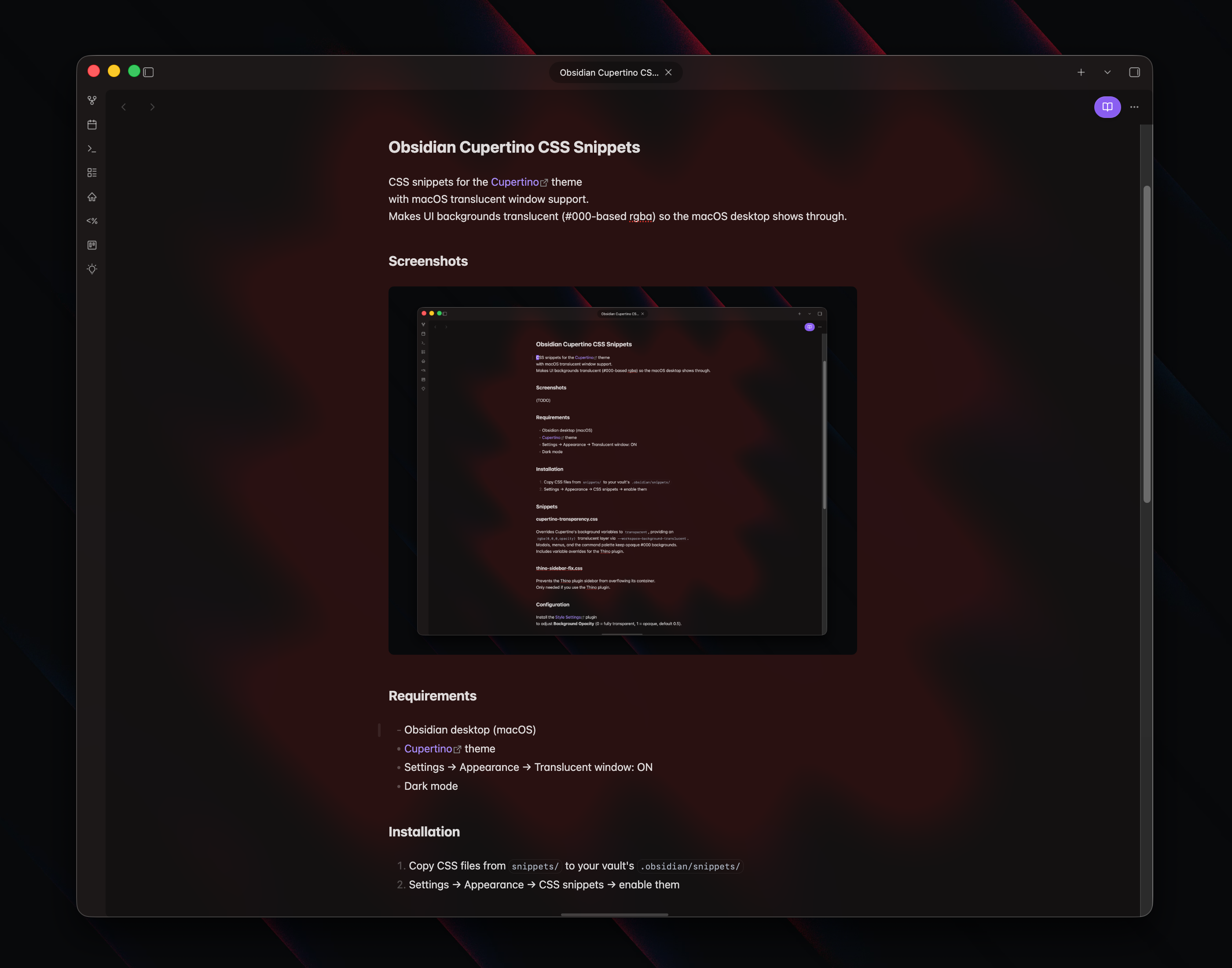 CSS snippets for macOS translucent window support with the Cupertino theme for Obsidian.