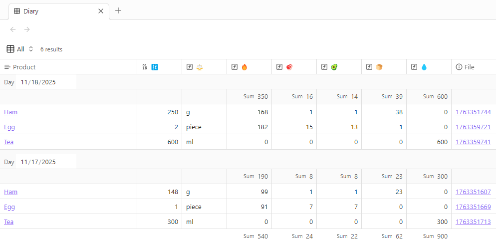 day— date of the meal (auto-filled with today's date)product— link to the product cardquantity— how much you ate (in the same units as in the product card; e.g. 2 pieces or 150 grams)timestamp— time / timestamp (used for sorting, auto-filled)